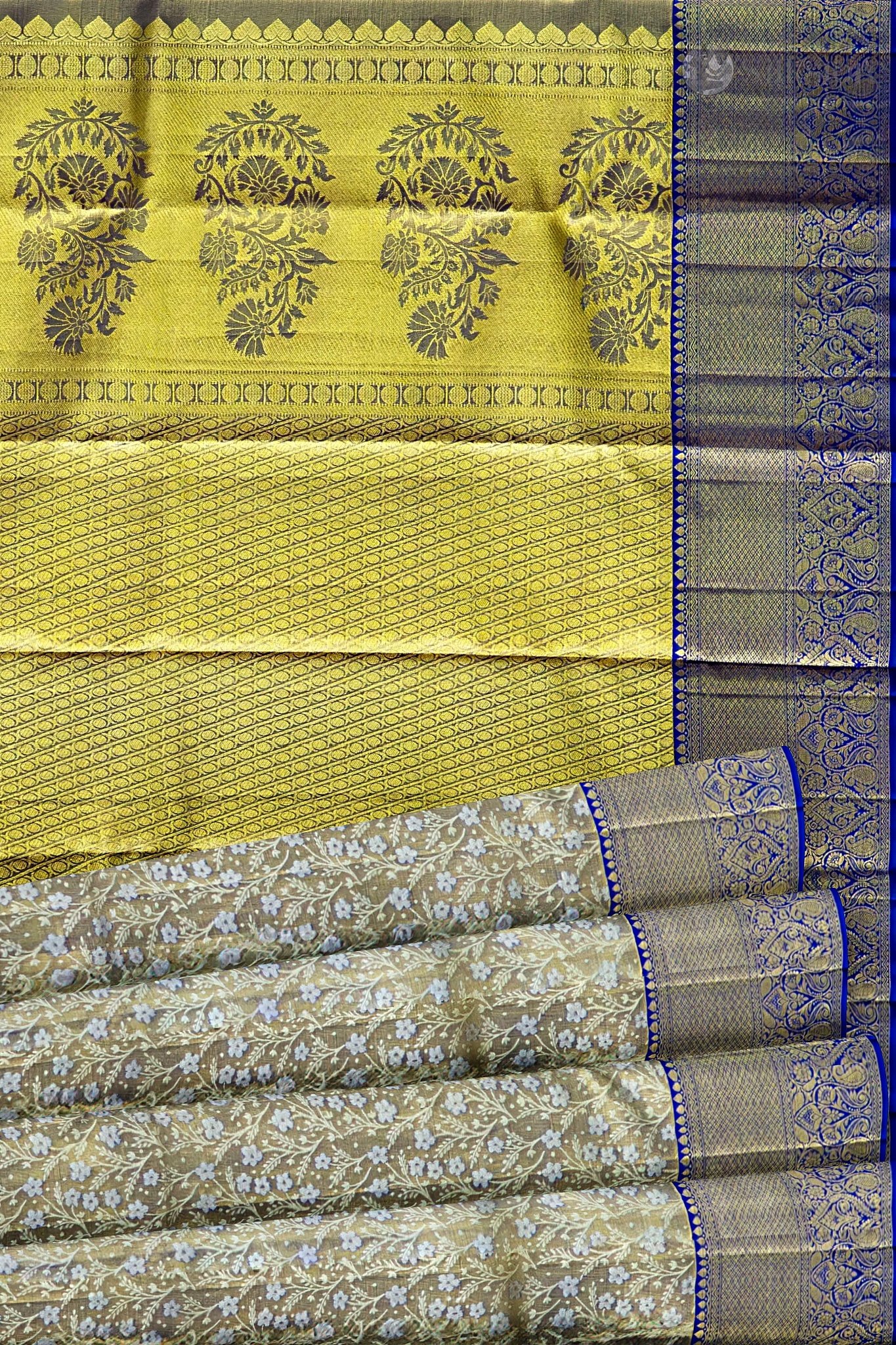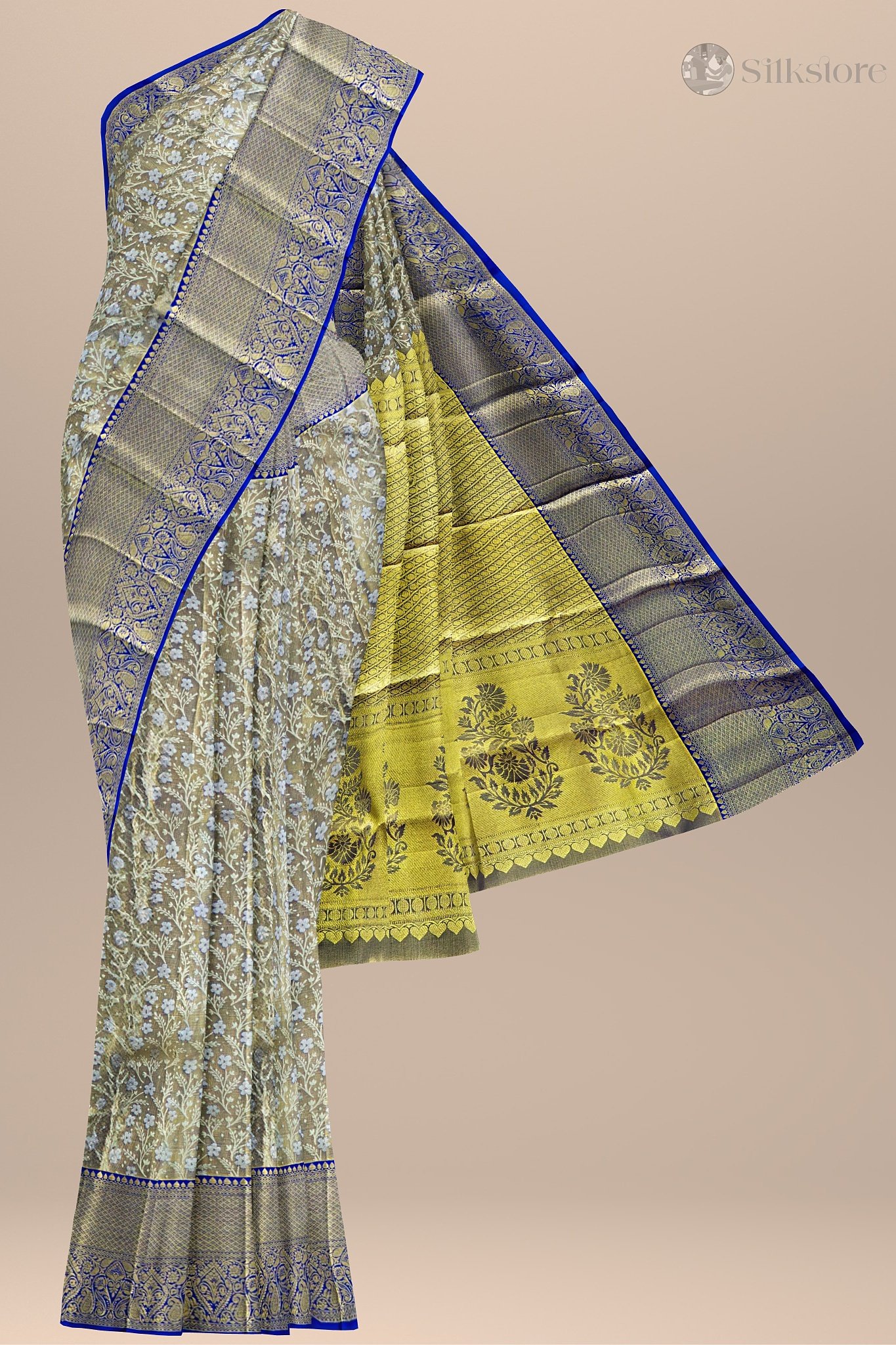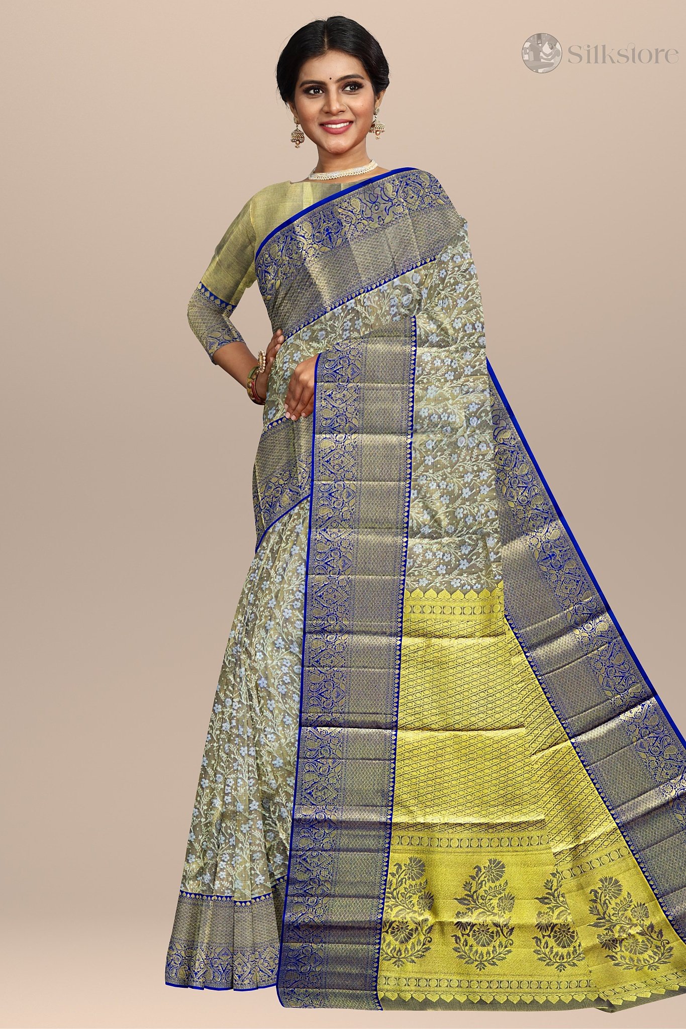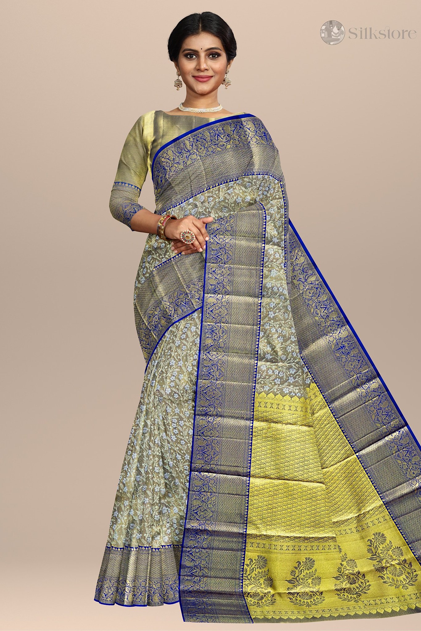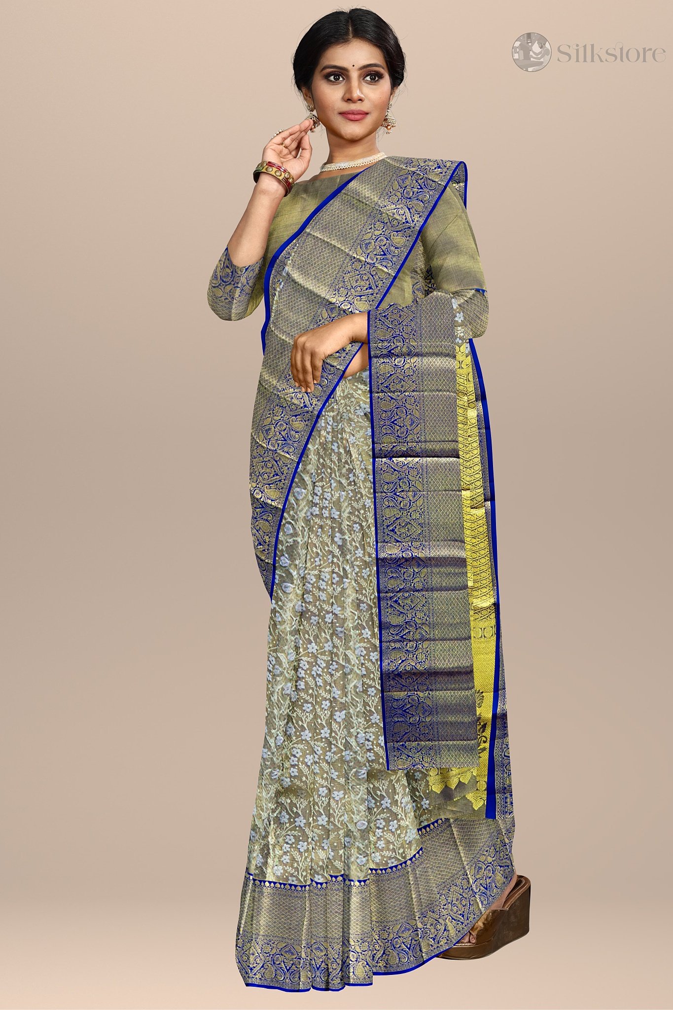 Color:Â BlueFabric:Â Pure Kanjivaram SilkBorder:Â Golden Zari BorderOccasion:Â Weddings, Festive Celebrations, Special Gatherings