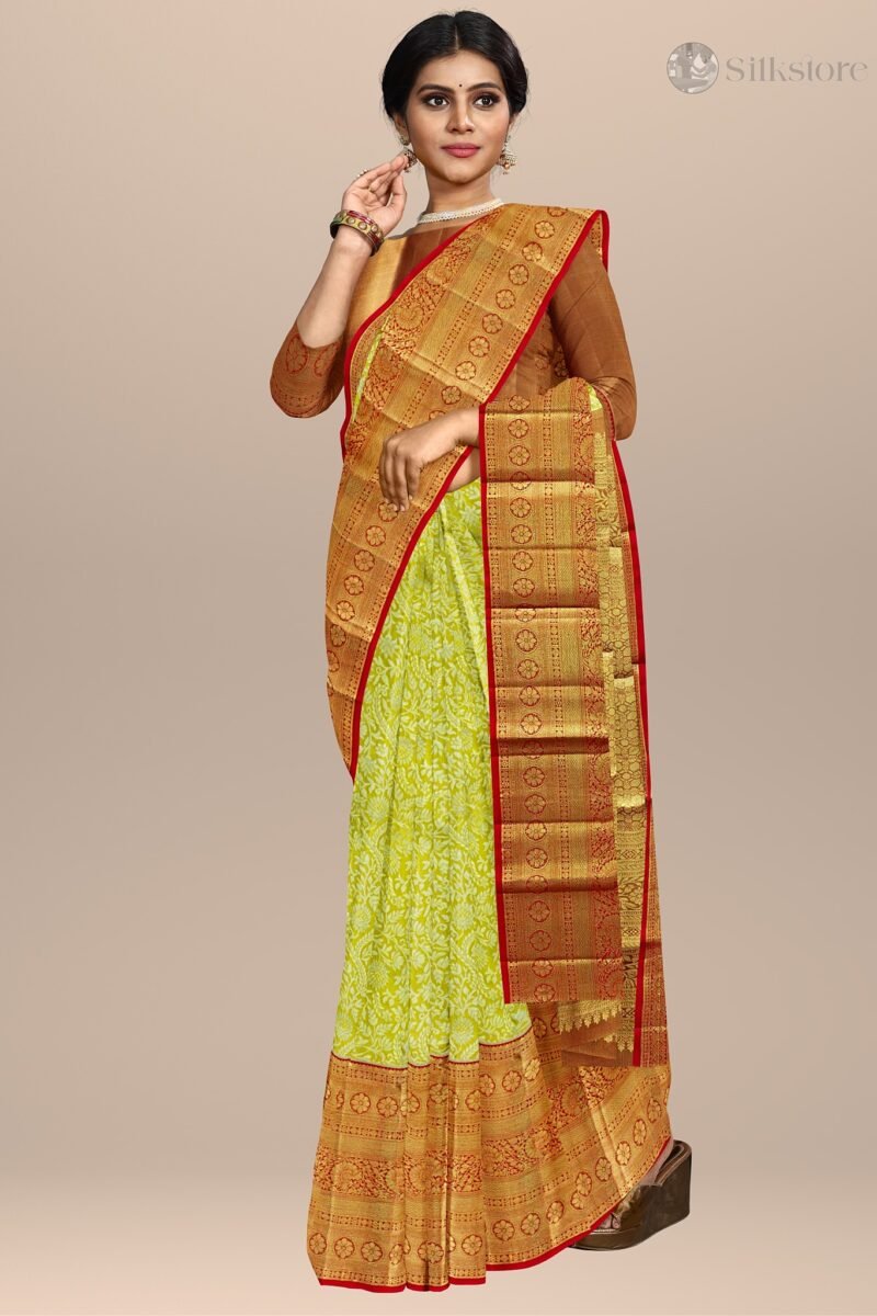 Red Floral with Green Woven Border & Pallu Silk Saree